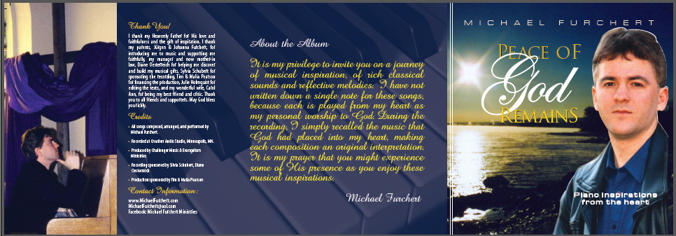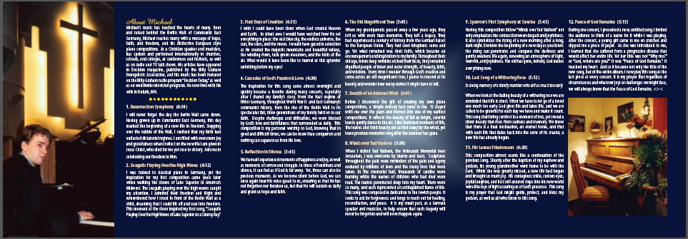 Today his distinctive music has become a firm part of his ministry. Not a single note has been written down. From rich classic sounds to gentle, reflective melodies, the music lives in Michael’s heart. He believes that it was given to him as a gift of God and plays it as his personal worship back to Him. During concerts and recordings he recalls the music from within, making each composition an original interpretation. Michael’s music and the story behind its creation has moved and touched many hearts across America.